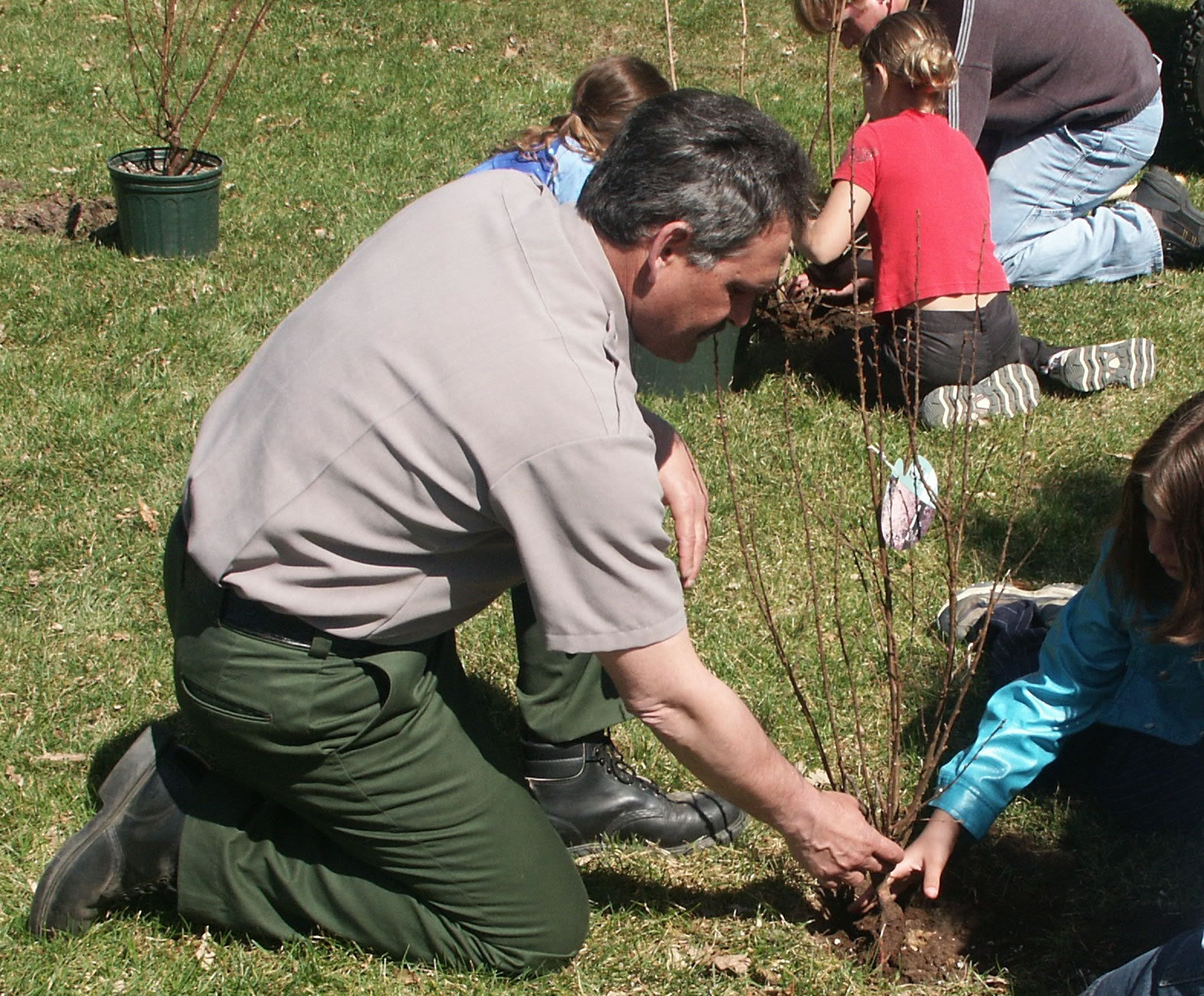 Photo by: Jeff Kleinert Earth Day Park Ranger John Zahalka helps kids plant a shrub on Earth Day. |