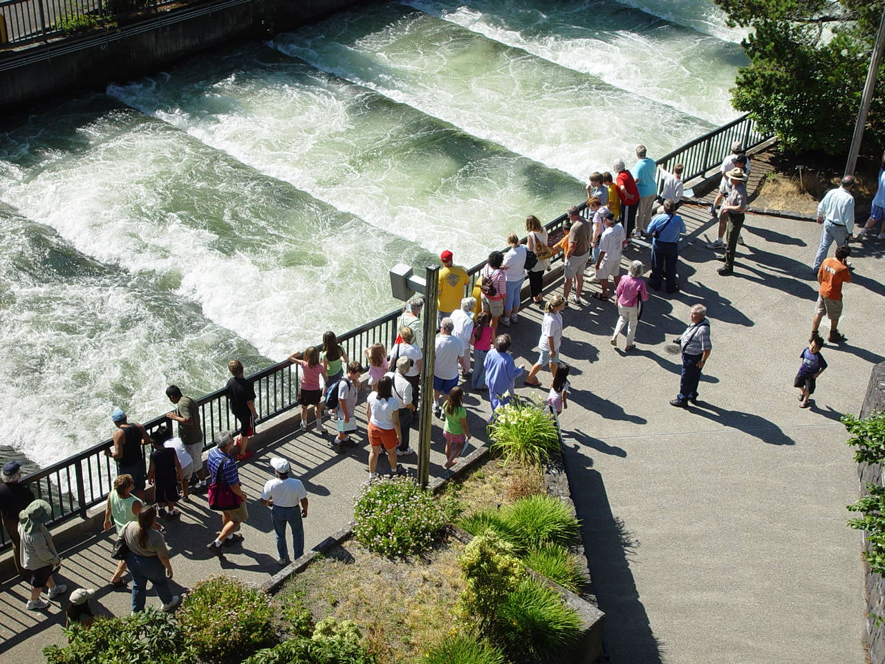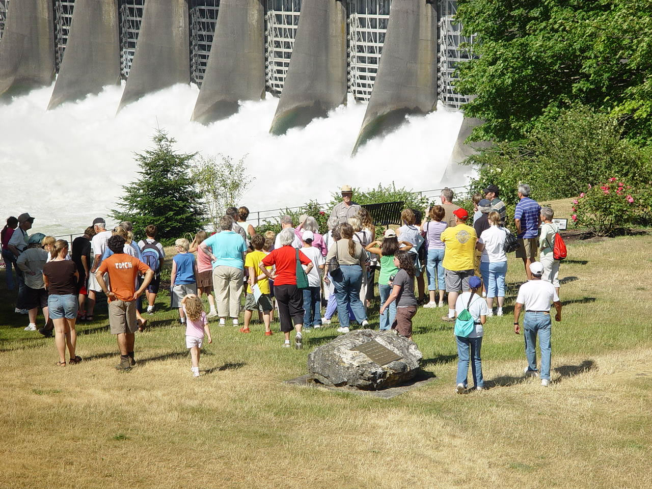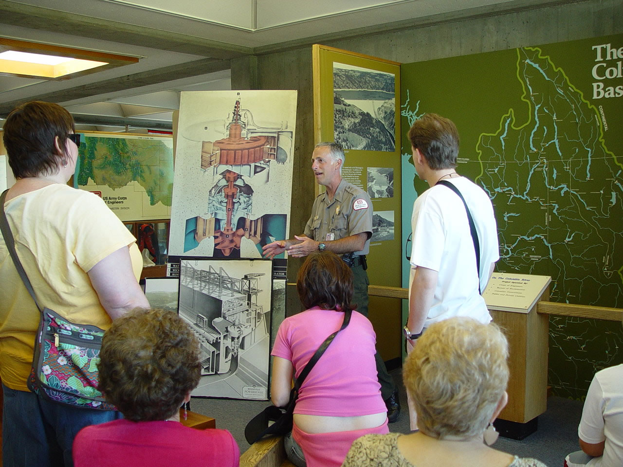 Photo by: Robin Norris Bradford Island Visitor Center Ranger Pat Barry leads an interpretive program near the Bonneville Dam spillway. |