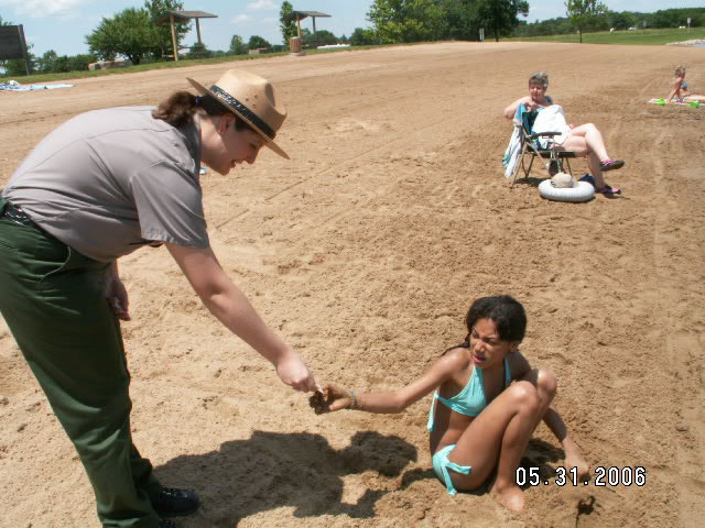 Photo by: Park Ranger Amber Tilton Outreach Program at 4-H Camp Ranger Tony Schoenecker doing a water safety program teaching hypothermia with the game Cold Hand Luke |
