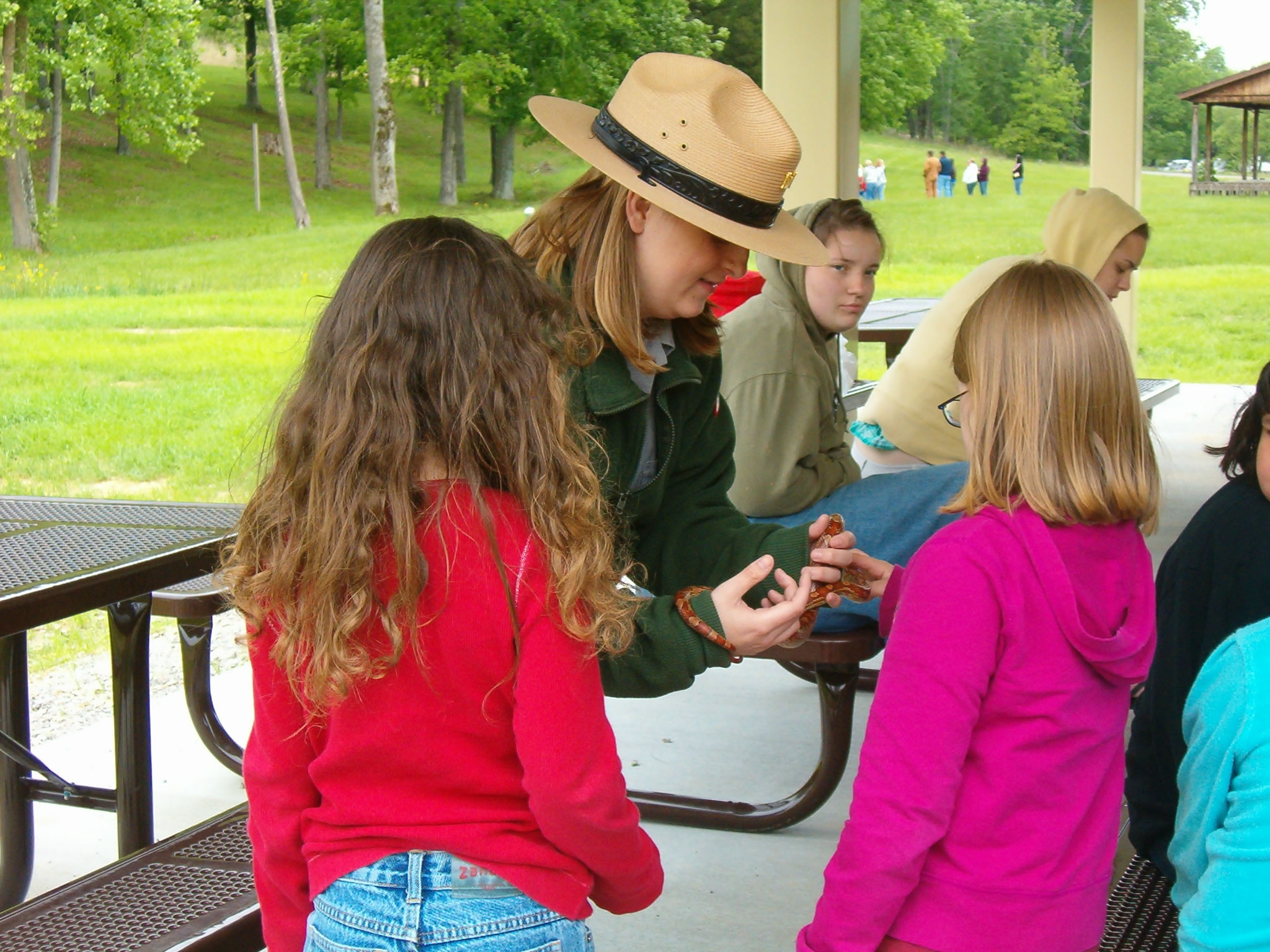 Photo by: Tammy Simpson Park Ranger Alicia Cannon is introducing two girls to Belinda the Snake. Belinda is Alicia's snake which is used in multiple interpretive programs throughout the year tot teach children about reptiles. |