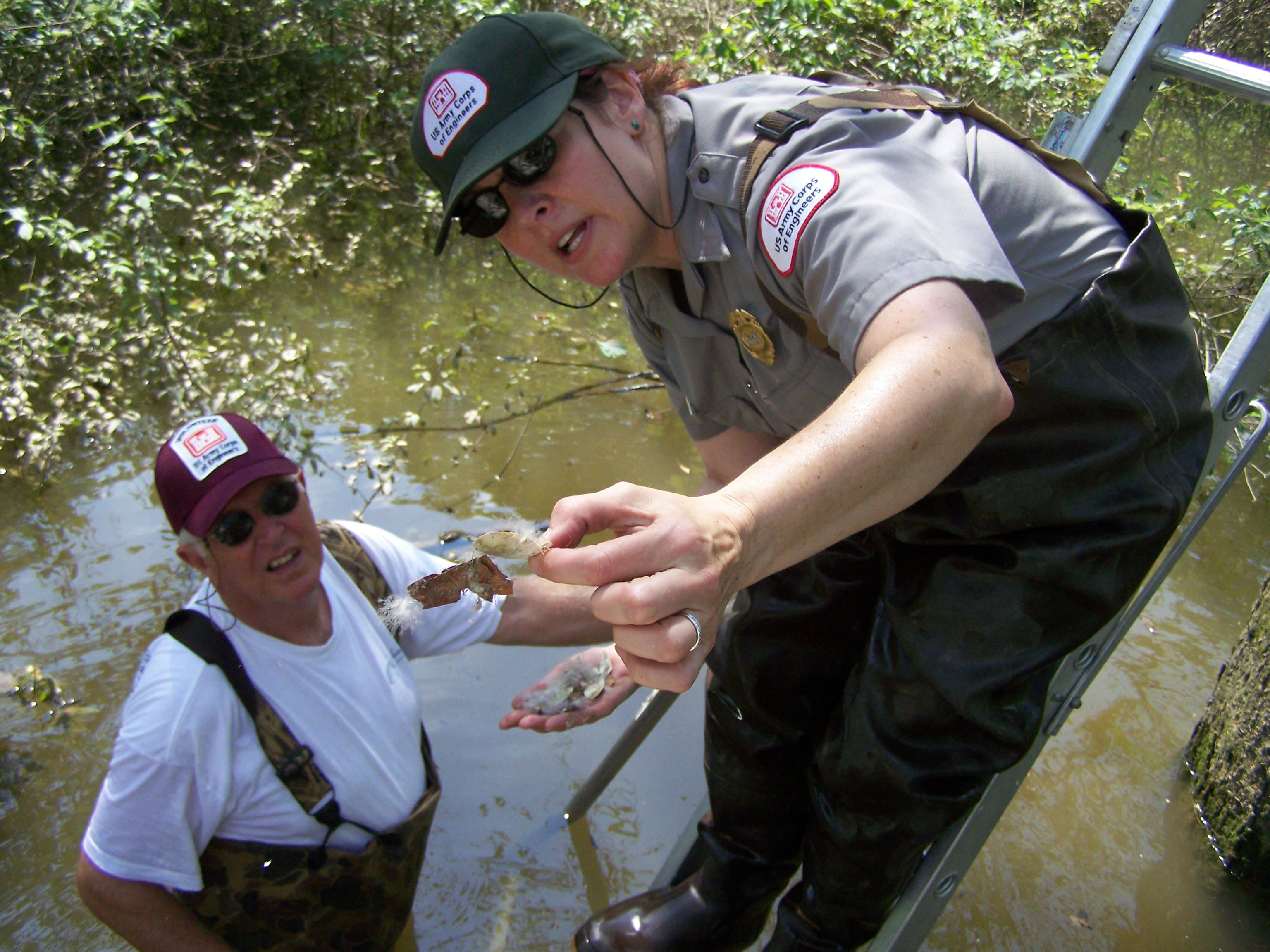 Ranger explains signs of a successful wood duck hatch to Volunteer Mike Thompson. |