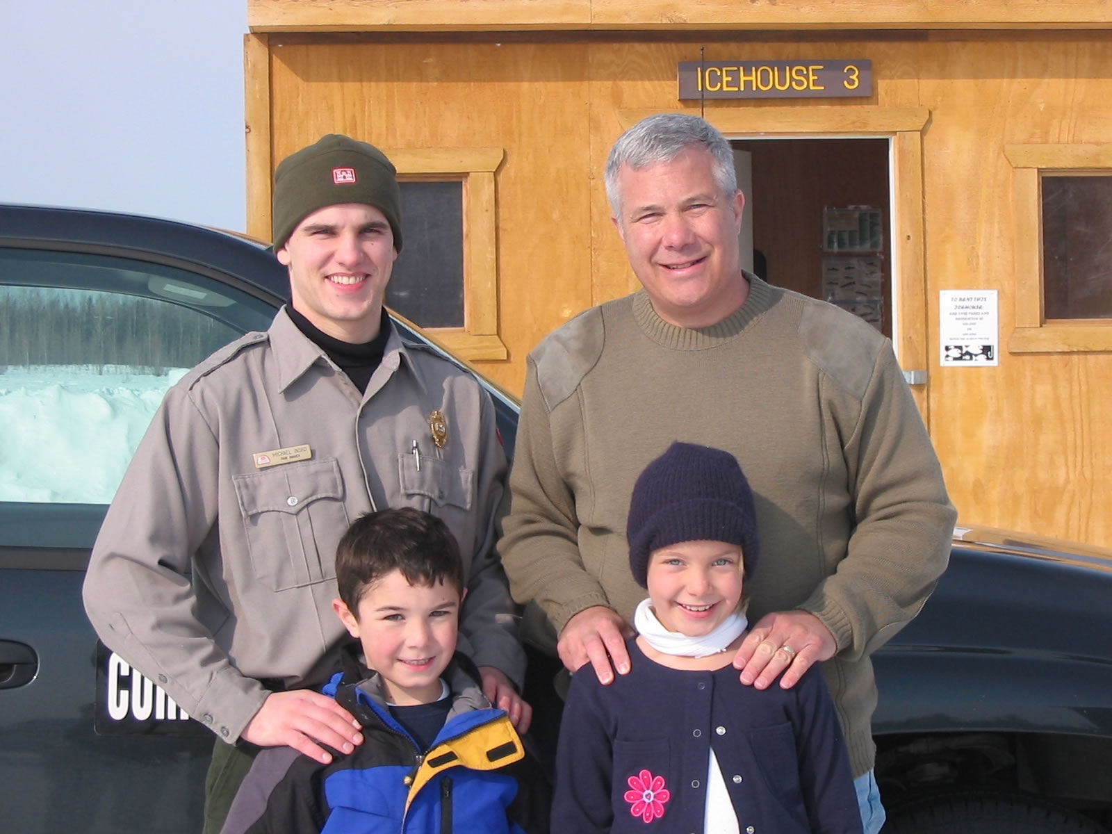 Park ranger visiting with the icefishing public. |