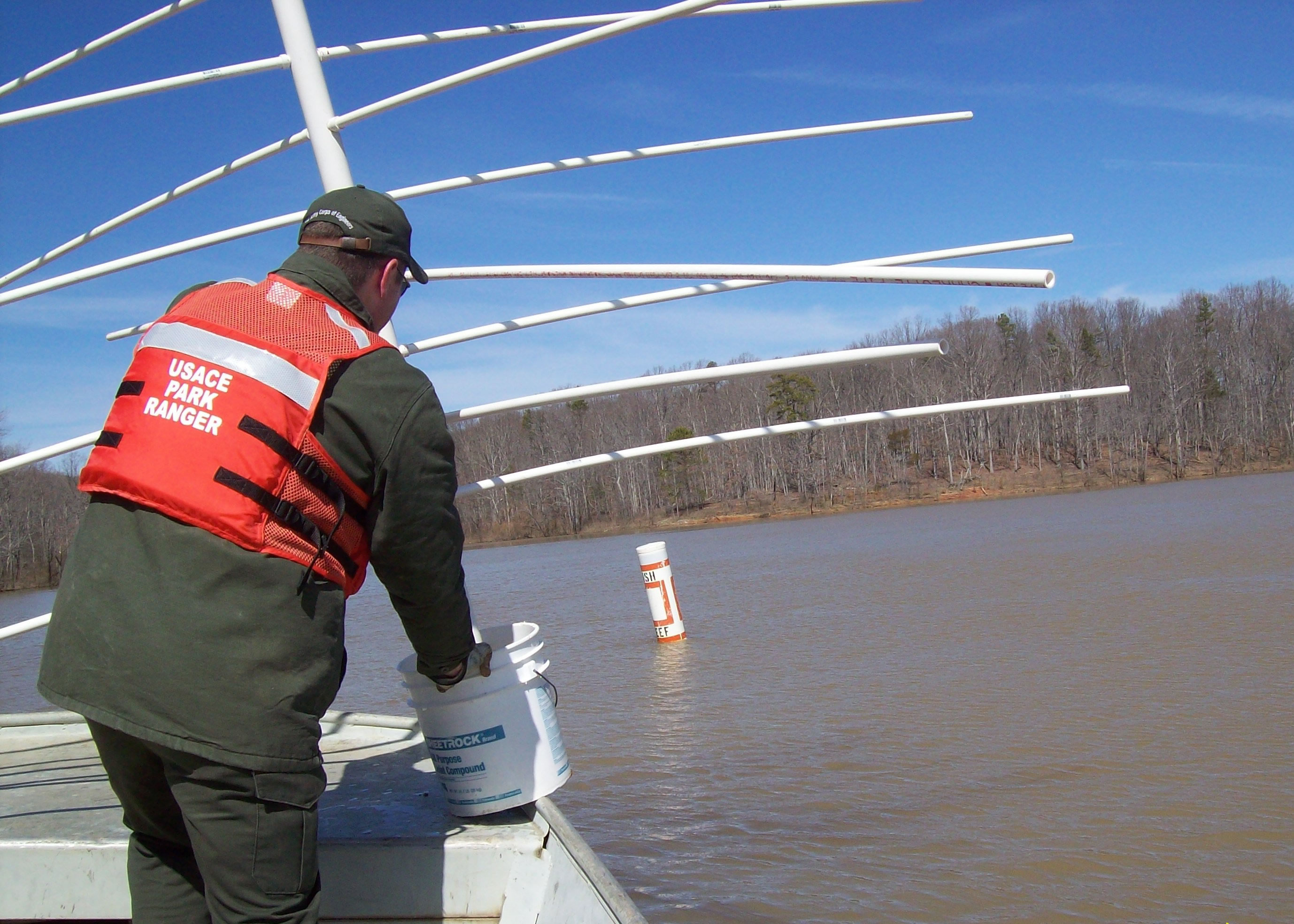 Photo by: Robert Burick A ranger from John H. Kerr Reservoir gets ready to drop a fish structure, creating an artificial fishing reef. |