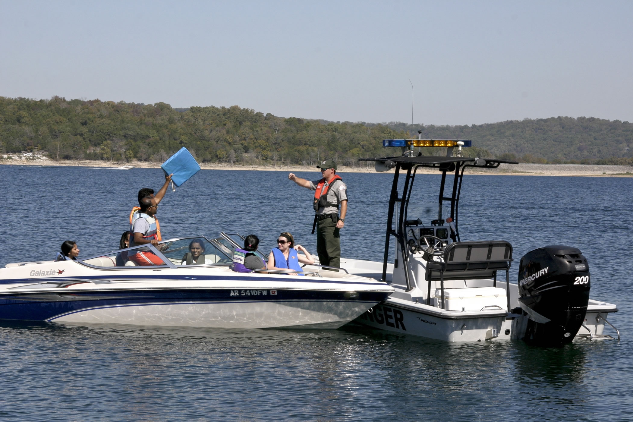 Photo by: Rob Carr Ranger performing a vessel safety check on Beaver Lake |