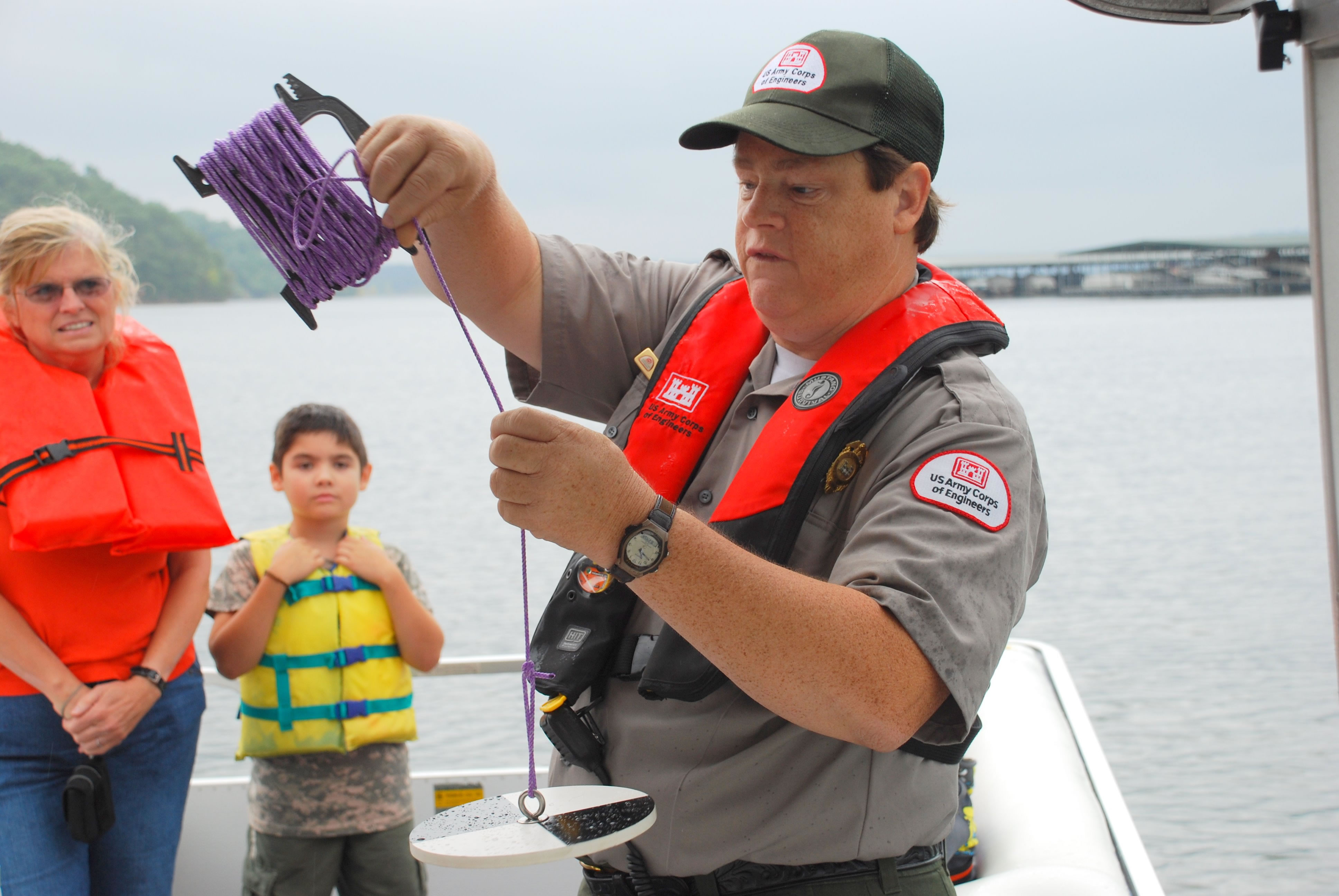 Photo by: Artie Hoff Water Safety Booth Park Ranger, Liz Garlington teaches a future lifeguard the proper technique to use a throw bag water rescue device. |